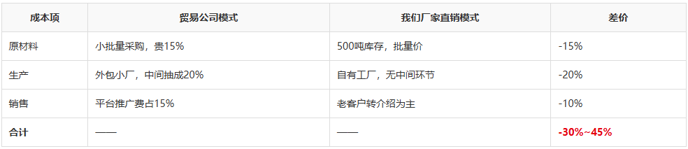 这30%-45%的差价,我们一部分让利给客户,一部分投入更好的材料(如加厚到2.0mm)。所以能做到价格便宜质量好——不是 magic,是模式差异。
